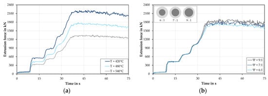 Figure 12. (a) Numerically predicted force-time curves for an extrusion ratio of 6:1 for different billet temperatures at a ram speed of 2 mm·s−1; (b) For different extrusion ratios at a billet temperature of 480 °C and a ram speed of 2 mm·s−1.