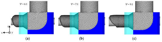 Figure 13. Material flow inside the tool and through the die after a stroke of the dummy block of 74 mm. (a) For an extrusion ratio of 6:1; (b) For an extrusion ratio of 7:1; (c) For an extrusion ratio of 9:1.