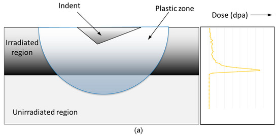 The construction of high efficiency, low waste nuclear reactors (such as Gen IV reactors) necessitates the use of materials resistant to severe operating conditions (radiation doses of up to 200 displacements per atom (dpa) and temperatures of up to 700–1000 °C) [1,2,3]. A major obstacle in performing research on the effects of extremely high radiation dose on the microstructure and mechanical properties of the relevant structural materials is the extended time period necessary to impart these doses in the available research reactors. The application of such large amounts of neutron flux also results in the samples becoming radioactive and, creates problems in handling and further sample processing for characterization and testing. Ion irradiation can be used as a viable surrogate or alternative for achieving high radiation damage doses, while avoiding the problem of radioactivity in the irradiated samples [4]. The use of ion irradiation results in the formation of an extremely thin damaged layer, ranging typically from a few hundred nanometers to about 10 μm. Most of the radiation affected thickness, starting from the surface, has a very low dose, which increases rapidly close to the range of the ions [5]. The limited thickness of the ion irradiated layer and the sudden change in the dose near the end of range create difficult obstacles in the proper assessment of hardness changes and plastic behaviour in the irradiated regions. A variety of testing methods have been utilized up to now to study the consequences of ion irradiation in regards to the mechanical behaviour of the radiation-affected layers. These include instrumented nanoindentation, micro/nano-pillar compression, cantilever bending, and micro-tensile testing. These methods are used in measuring a variety of effects, such as changes in hardness, residual stress, tensile strength, etc. While residual stress is affected by irradiation, sometimes actually changing in nature from tensile to compressive [6], and there are various methods for measuring this effect, such as suggested by Ghidelli et al. [7], the focus of this paper is on the measurement of changes in hardness due to ion irradiation, and therefore, this aspect of residual stress will not be discussed further here, although it is an important effect which will be considered in a separate study.