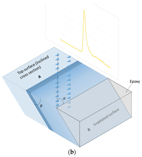 In this method, the nanoindents were made in the non-CSM mode, as mentioned in the experimental section. A series of nanoindents were made on the oblique surface (cut at 15° to the irradiated surface) at an angle of ~4° to the edge of the sample, as shown in Figure 1. The projected depth d of the nanoindents with respect to the irradiated surface was calculated using the following formula
