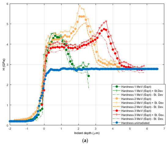 However, it is clear from the plots of the top-down hardness measurements that the position of the hardness peak becomes progressively uncertain with increasing ion energy, as the hardness profile gets flatter e.g., for the 3 MeV ΔH curve, there is a broad flat peak, almost a plateau, between ~350–700 nm. This happens because of the large plastic zone below the indent at greater depths, resulting in an averaging of hardness over a large volume with great variation in hardness (see, e.g., the plastic zone in the 2 MeV model in Figure 10a). On the other hand, the OCS method results in sharp hardness peaks even for high energy samples, since the depth of penetration of the indents remains small (250 nm in this case) for all indents, both near and far from the irradiated sample surface. Therefore, this characteristic becomes a distinct advantage for the OCS method when the ion energy is high (with a deeper peak damage layer).