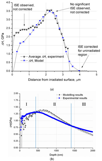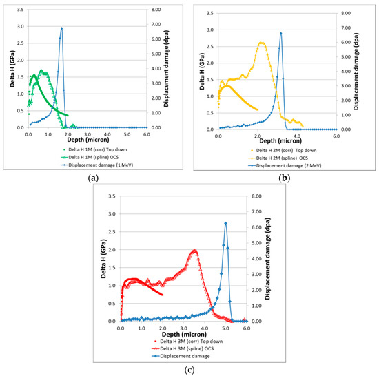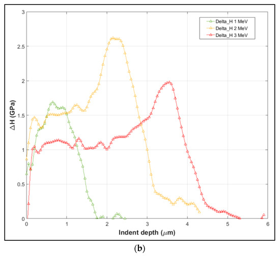 In order to correct for the sample/epoxy interfacial effect, and to calculate the hardness increase due to irradiation, the hardness profile of the unirradiated sample was subtracted from that of the irradiated samples. This was achieved after aligning all the samples to the reference of zero depth at the first indent on the epoxy–sample interface. The resulting ΔH-depth profiles for the sample irradiated with 1, 2, and 3 MeV He to a fluence of 1 × 1017 ions/cm2 are given in Figure 4b [15]. Some observations that can be made from this graph are: