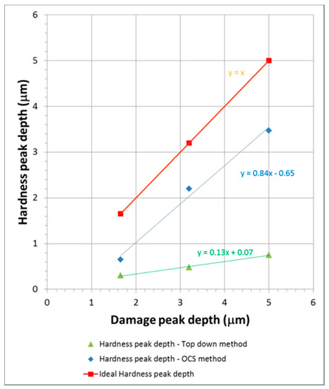 It is evident from the two plots of hardness peak vs. damage peak in Figure 6 that the hardness peaks in the OCS method are closer to the actual damage peaks than those in the top-down method. This is expected as indent depth, and therefore the plastic zone, is much smaller in the OCS method than in the top-down method (see Figure 10). Therefore, the volume ‘sensed’ by the indenter is much smaller in the OCS method, providing for the closer occurrence of the hardness peak to the damage peak.