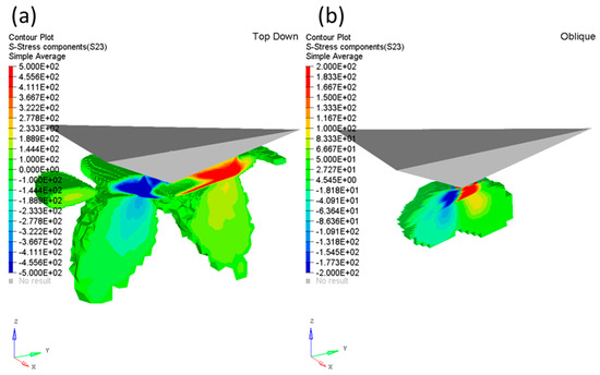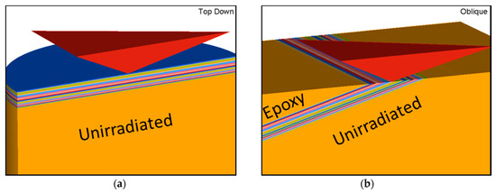 The fitting exhibits small under-predictions for low irradiation doses and over prediction at higher irradiation levels, as outlined in our earlier study. The domain discretisation for each model differs insofar as to allow for the designation the material properties in the direction of sample orientation. The top-down approach employs larger domain to account for the larger indentation depths, 2000 nm (vs. 250 nm for oblique specimen), with the irradiated layers discretised horizontally. In the oblique nanoindentation method the elements are oriented at 15° to the horizontal plane with a material property variation to represent the slanted irradiation layers. The two different configurations are shown in the schematic diagrams of Figure 7a,b, respectively.