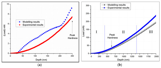 Analysis of the load–displacement curves of the two techniques highlights some significant differences in the two methods, Figure 9a,b respectively. The point at which peak hardness is detected in each case is highlighted but the area function differs slightly from the experimental results due to the idealization of the tip geometry in the FE models and the length scales the used in the computation. We observe a divergence in the load paths between the model and the experiment for the OCS case. The authors attribute this to: