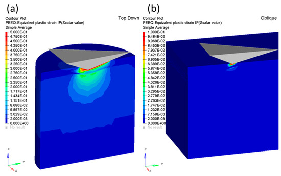 Equivalent plastic strains for (a) top-down method at an indent depth of d = 2000 nm, and (b) OCS method at an indent depth of d = 250 nm.