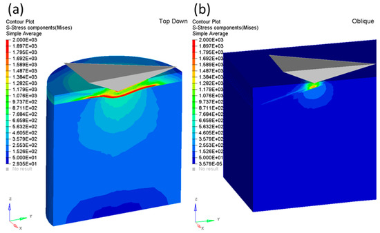 Von Mises stress (a) at d = 2000 nm for Top-down method, and (b) at d = 250 nm for the OCS method.