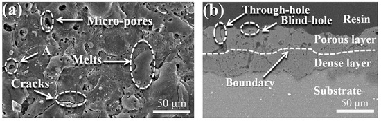 (a) Surface and (b) cross-sectional morphologies of micro-arc oxidation (MAO) coating.