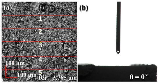 (a) Surface roughness of the MAO coating and (b) water contact angle of the MAO coating.