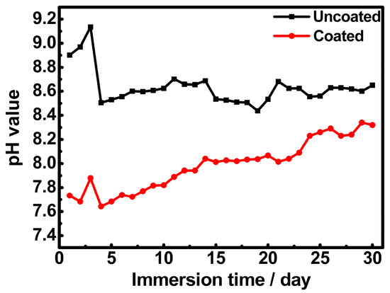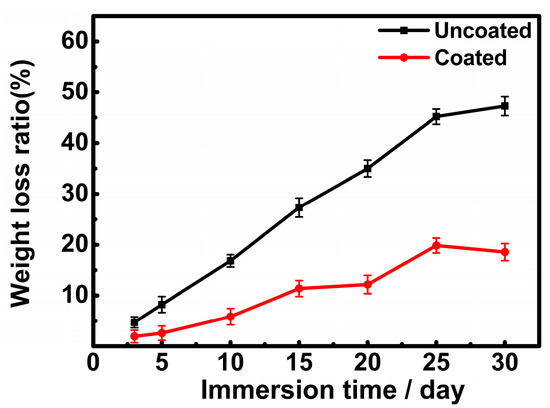 The uncoated sample corroded rapidly in the early stage of the immersion test, releasing many electrons into the solution (Equation (2)). More and more OH− ions were produced by the reaction shown in Equation (3), leading to a fast increase of the pH value. However, OH− and Mg2+ ions were consumed by the forming Mg(OH)2 (Equation (4)). Then, the reactions in the solution gradually reached equilibrium, and the pH value became relatively steady. From Figure 5, it can be seen that the weight loss of the uncoated sample increased remarkably and then slowed down in the late stage (after the 25th day) because of the deposition of corrosion products. The degradation of the uncoated sample was inhibited.