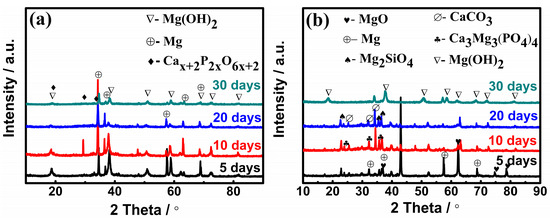 Figure 6a–d display the variations of the morphologies of the uncoated samples immersed in SBF for different amounts of time. In the early stage of the immersion test, the surface of the sample was covered with some network structure formed by the crossing of needle-like products (Figure 6a,b). After 20 days, some white flocculent products deposited on the network structure and the network structure gradually disappeared (Figure 6c,d). According to the XRD results (Figure 7a), the network structure was composed of Mg(OH)2 and the flocculent product was Ca-P compound. The main phases of the uncoated sample in the early stage were Mg(OH)2 and Mg, while few Ca-P compounds could be detected. In the late stage, the peak of Mg(OH)2 became weak, but the peak intensity of the Ca-P compound became stronger due to increased deposition of the Ca-P compound.
