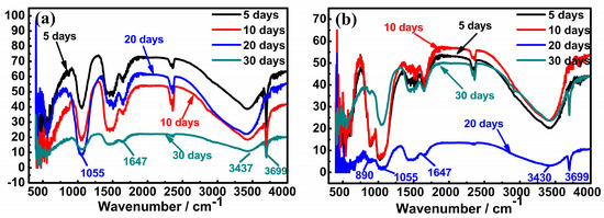 FTIR results of uncoated samples and coated samples under different immersion times are shown in Figure 8. For uncoated samples, the C–O and C=O stretching vibration mode occurring at 1055 cm−1 and 1647 cm−1 are ascribed to the carbon ionic groups of the SBF solution, which might diffuse into the corrosion products in the form of ions. Furthermore, the O–H bands vibration mode occurred at 3437 cm−1. Obviously, the absorption peaks of O–H became wider with immersion time, demonstrating that the association between functional groups was enhanced. It could also be found that O–H sharp stretching vibration mode occurred at 399 cm−1, which could be attributed to the dissociative O–H [51]. According to the FTIR spectrum results, the content of Mg(OH)2 increased with immersion time.