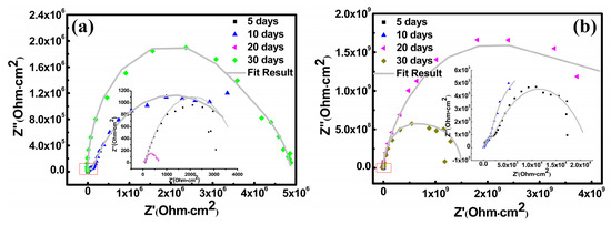 The Nyquist plots of both uncoated and coated samples after immersing in SBF for various amounts of time are presented in Figure 9. Equivalent circuits for fitting the uncoated and coated samples are shown in Figure 10. The non-ideal capacitive behavior of the coating is taken into account by using constant phase element (CPE) instead of capacitances in the model [53,54]. In the equivalent circuits, Rsoln is the SBF solution resistance, Rcp is the corrosion product resistance with constant phase element CPEcp, Rcoat is the coating resistance paralleled with constant phase element CPEcoat, and Rct is the reaction resistance paralleled with constant phase element CPEct. The use of a CPE was necessary due to the distribution of relaxation times resulting from heterogeneities at the electrode surface [55]. The impedance of the CPE is given by Equation (5) [56]: