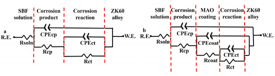 Equivalent circuits for fitting the impedance data of (a) the uncoated and (b) the MAO coated samples in SBF. CPE: constant phase element.