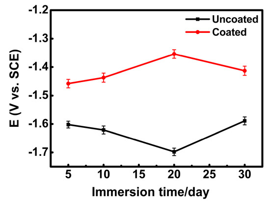 The evolution of open circuit potentials for the uncoated and the coated samples after immersion for 30 days.