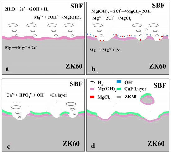 Li et al. [57] suggested a biocorrosion model that can be used to describe the corrosion process of Mg alloys. According to this concept, the degradation model of ZK60 Mg alloy in SBF is proposed as shown in Figure 12a. Xu et al. [18] indicated that uniform corrosion and localized corrosion are the two mechanisms during the degradation process. In the early stage of immersion, Mg encounters an anodic dissolution (Equation (2)), accompanied by the release of H2 and the Mg(OH)2 film formed on Mg alloy (Equations (3) and (4)). This is a uniform corrosion process, as shown in Figure 12a. In SBF, localized corrosion is mostly due to the penetration of Cl− ions from the solution. Lederer et al. [58] reveals that Cl− ions can not only damage the Mg(OH)2 film, but also corrode the Mg alloy. The reactions are suggested as follows: