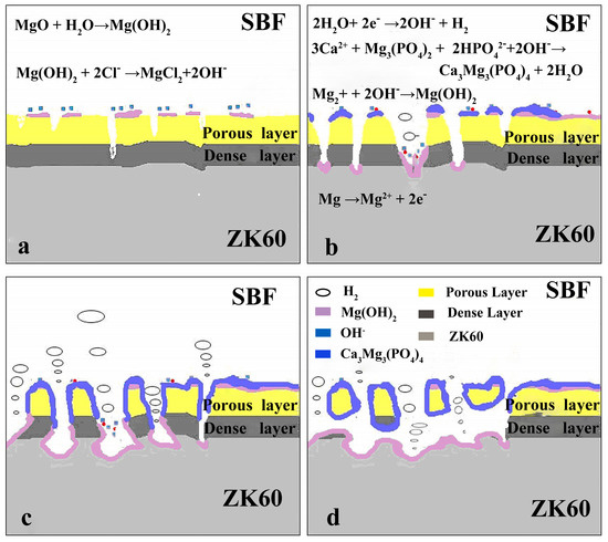 Gu et al. [19,35] suggested a degradation model of the MAO coating in SBF (Figure 13). Generally, the MAO coating consists of a porous layer and a dense layer. In the early stage of immersion, only the MgO from the coating reacts with the solution. The reaction is shown below: