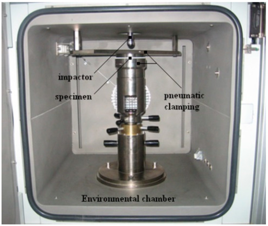 Test specimens were prepared of 100 mm × 100 mm × 1.2 mm dimensions from high manganese steel blanks according to the drop weight impact test conditions. The CEAST 9350 drop weight impact test machine (Instron, Norwood, MA, USA) was used to analyze the deformation and damage behavior of Hadfield steel sheets and to characterize the impact velocity test. Figure 1 illustrates that the base of the machine is engineered as an environmental chamber as well as a pneumatic clamping device [25]. Drop weight impact tests were carried out with according to the standard of ASTM D5628 FE [26].