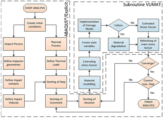 Operational parameters accomplished in the VUMAT subroutine are illustrated in Figure 2. The flow diagram systematically shows the relationships between the steps of the numeric model through the finite element method. The most important factors that ensure this flow chart are original are that the accuracy and reduced working time of the parameters used in the construction of the numerical model according to the data obtained from the test results are determined/converged and the damage geometry is formed during the obtained stages. Therefore, it is another advantages that help us to understand the associations of the physical parameters with each other for the next different dimension studies in the framework of the obtained parameters of the model. In this figure, the theoretical background of damage modeling of the material is well-described. The damage modeling of material carried out by means of analytic equations with FORTRAN® software is inserted in Abaqus®/Explicit.