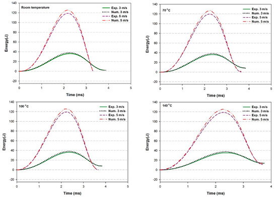 Energy-time histories of experimental and numerical impact results for different temperatures and impact velocities.