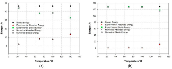 A summary of a comparative study is given in Figure 6. To evaluate the level of impact and the elastic and absorbed energies for both impact velocities, see Figure 6a, 3 m/s and Figure 6b, 5 m/s, respectively. All of three energy levels are compared depending on the temperature.