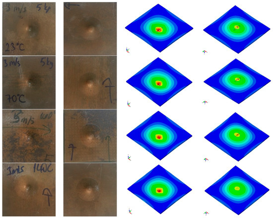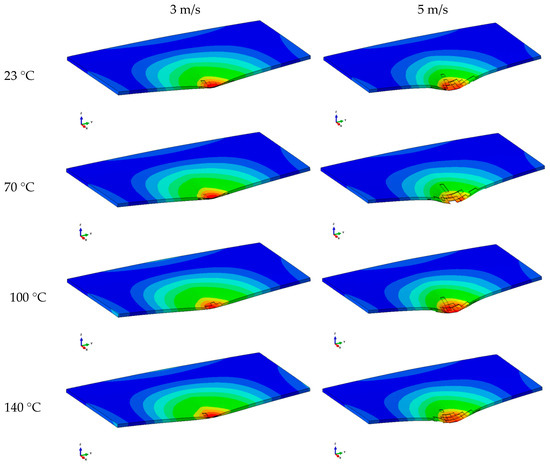 In the case of impact velocity of 3 m/s, high elastic energy is transformed from both total impact energy and evidently low absorbed energy, obtained from the total impact energy variable with temperature. However, the specimens deformed with the impact velocity of 5 m/s have absorbed much more energy regarding the lower impact velocity with low elastic (vibration) energy converted from the total impact energy also variable with temperature. Consequently, the specimens impacted by the impact velocity of 3 m/s show a low deformation level more distributed on the specimens. These observations and the evolution of impact energies can be easily observed with the images obtained by the FEM model in Figure 7 and Figure 8, evaluated here.