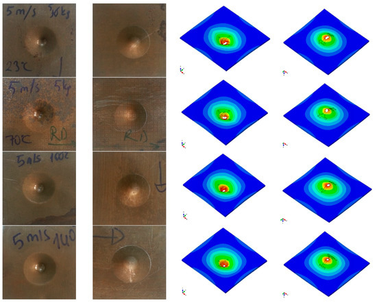 Figure 8 shows the final damage shapes obtained from experimental and numerical studies under experimental speeds of 5 m/s and at different temperatures. As stated in Figure 7, as a result of increasing the temperature, it is observed that the final damage patterns on the specimens changed very little. Generally, it has been determined that the samples under high temperature absorb more energy. Furthermore, when comparing the ultimate damage shapes obtained as the result of experimental and numerical studies, it is seen that there are small tears in the final damage shapes obtained in the numerical studies. The reasons for these are that the internal structure of the numerical model specimen is completely homogenized, although the internal structure of the specimen under real physical conditions is geometrically very complex at the micro-scale.