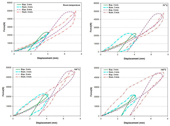 Force-displacement curves of experimental and numerical impact results for different temperatures and impact velocities.
