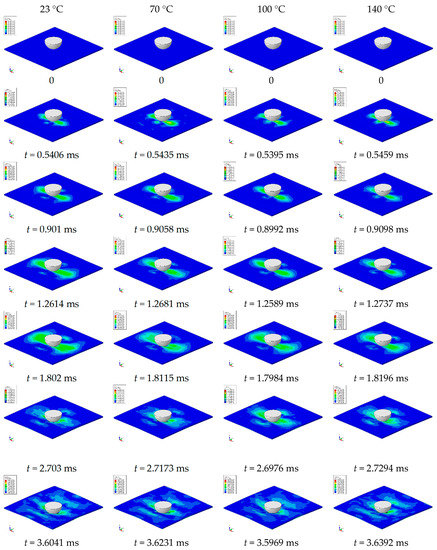 These ideas on the stress distributions discussed above are presented in other way in Figure 11. Here, the stress distributions (damages caused by the stress distributions are detailed in Figure 7, Figure 8 and Figure 9) of Hadfield manganese steel are explained with distribution of deformation on the sheet samples at high impact velocity levels (5 m/s) depending on the time elapsed from the beginning of the impact up to the saturation levels around 3.6 s. In fact, the total deformation time is divided into 20 equal elapsed times. For the sake of simplicity, here, only six elapse times are presented for observing the evolution of deformations distributed on the sheet specimens. As seen in Figure 11, deformations are very compact mainly around the punch (up to t = 1.8 s) and arrive at a saturated level around 3.6 s and quasi the same for all the test temperatures used in the present work. Additionally, partially, the effect of the spring back phenomenon is also another point that should be remarked upon here.