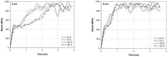 These evolutions are also very apparent in Figure 12 to clarify the results presented in Figure 11. This means that the evolutions of the peak stress counters are shown by FEM simulation at two impact velocities for different temperatures.
