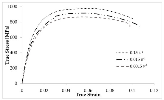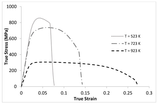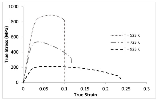 Tensile tests were conducted at room temperature (i.e., 298 K) as well as at three selected high temperatures of 523 K, 723 K, and 923 K. For each initial temperature, the specimens were tested at two different quasi-static strain rates of 0.0015 s−1 and 0.15 s−1 except for the room temperature where a third strain rate of 0.015 s−1 was considered. The obtained stress-strain data were recorded and converted into true stress-true strain curves, as illustrated in Figure 2, Figure 3 and Figure 4. The results represent average values of two or three specimens for each test condition.
