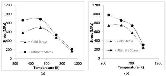 The thermomechanical response of the EN08 alloy is further investigated by studying the degradation trend of its flow stress with temperatures shown in Figure 5 for the lower and higher quasi-static strain rates considered. In general, the yield and ultimate tensile strengths of metals decrease with an increasing temperature. This is due to several factors such as a rapid increase in the atoms mobility, a greater mobility of dislocations based on the climb mechanism, the impact of diffusion-controlled processes particularly at a high temperature, and the increase of equilibrium concentration of vacancy. Thus, the deformation mechanisms could be changed at an elevated temperature where the activated slip systems change and/or additional activated slips come into play. Likewise, the higher the temperature, the greater is the possibility of deformation of grain boundaries.