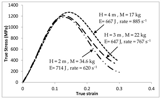 True stress-true strain curves from the drop-hammer tests at various masses and heights.