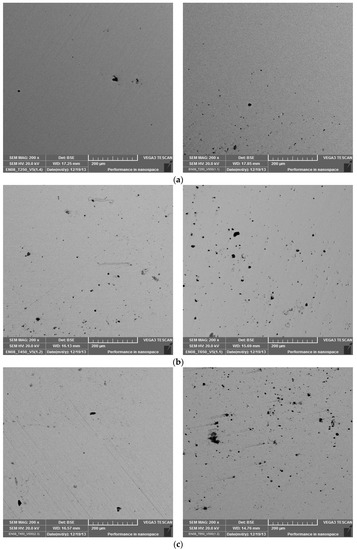 SEM images for polished samples at a temperature of (a) 523 K, (b) 723 K, (c) 923 K, and at strain rates of 0.0015 s−1 (left) and 0.15 s−1 (right).