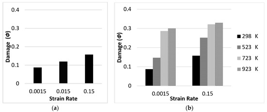 Average damage at (a) room and (b) high temperatures for different strain rates.