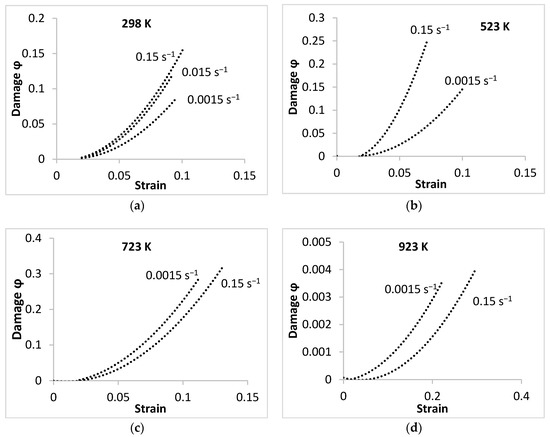 Damage ϕ evolution at quasi-static strain rates and temperatures of (a) 298 K, (b) 523 K, (c) 723 K and (d) 923 K.