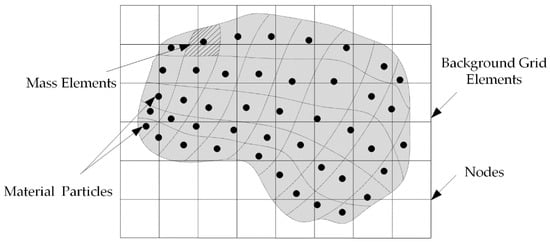 The main idea of the SMPM is to introduce the stochastic theory into MPM to make stochastic analysis of non-linear dynamics. Thus, the SMPM has similar features to MPM. In the SMPM, the continuum body is divided into a set of infinitesimal mass elements and these infinitesimal mass elements are represented by a finite collection of material particles, as shown in Figure 1.