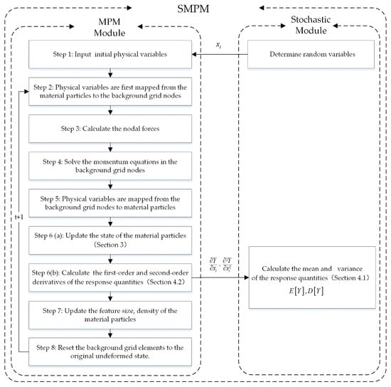 The key steps for SMPM, of which includes the coupling between MPM module and stochastic module and the return of the needed response quantities are illuminated in Figure 2. The following detailed steps are performed at each time step increment Δt: