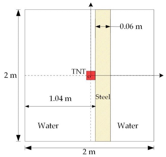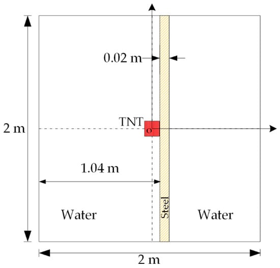 The computational domain is full of water with 2 m × 2 m × 2 m dimensions. A thick steel plate of 2 m × 2 m × 0.06 m dimensions is mounted within the domain, with the clamped edge condition assumed. TNT is a cuboid of 0.08 m × 0.08 m × 2 m dimensions and mounted on one side of the plate. Because of symmetry, the analogy model can be further simplified as a 2D planar model, as shown in Figure 3. To better monitor the stochastic response, two points, E and F, of the plate are chosen. Table 1 shows the locations of points E and F of the plate. The situations of the coefficient of variation (C.V) 0.01 and 0.05 are under consideration and the values of the parameters are given in Table 2.