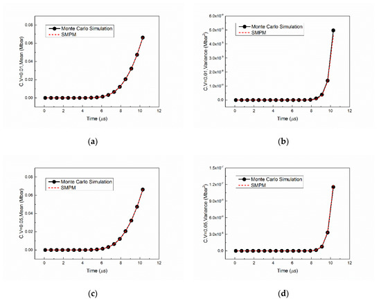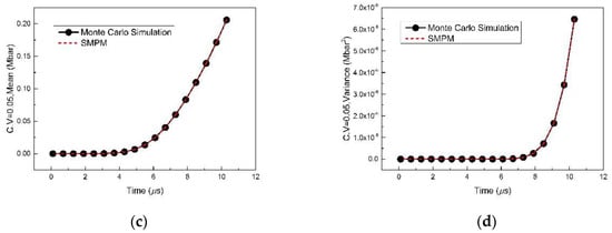 Pressure response of location E by various methods with C.V = 0.01 and C.V = 0.05: (a) Mean of pressure with C.V = 0.01; (b) Variance of pressure with C.V = 0.01; (c) Mean of pressure with C.V = 0.05; (d) Variance of pressure with C.V = 0.05.