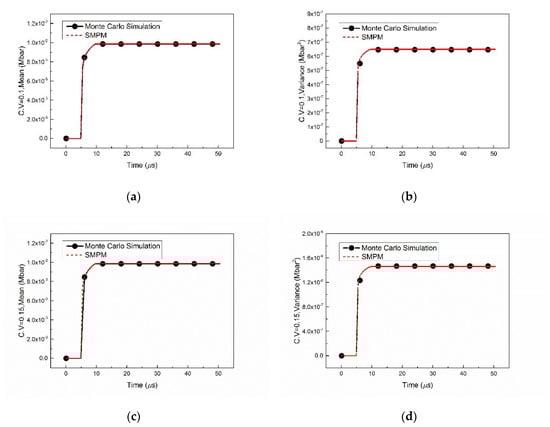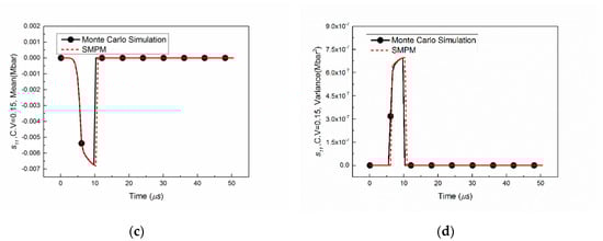 Deviatoric stress response of location G by various methods with C.V = 0.1 and C.V = 0.15: (a) Mean of with C.V = 0.1; (b) Variance of with C.V = 0.1; (c) Mean of with C.V = 0.15; (d) Variance of with C.V = 0.15.