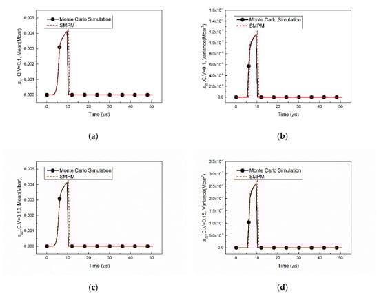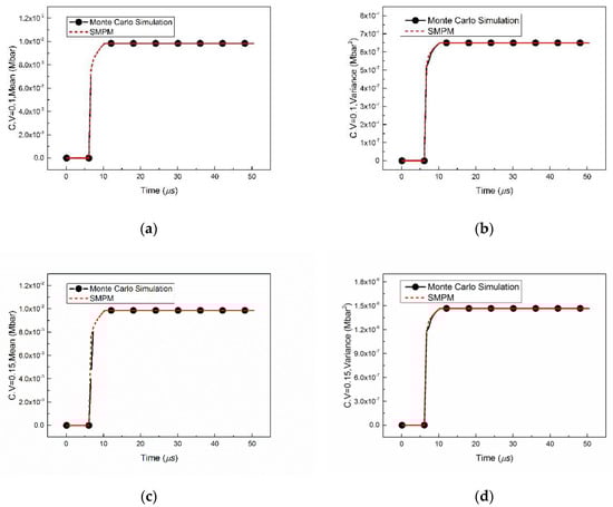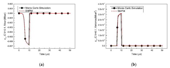 In order to better prove the accuracy of the proposed stochastic material point method, the mean and variance of the response are also counted. The mean and variance of the equivalent plastic stress σy and the deviatoric stress , are shown in Table 6, Table 7 and Table 8, respectively. The maximum relative error of the mean is less than 0.3% and the maximum relative error of the variance is about 3%. The results prove the correctness and accuracy of the proposed stochastic material point method.