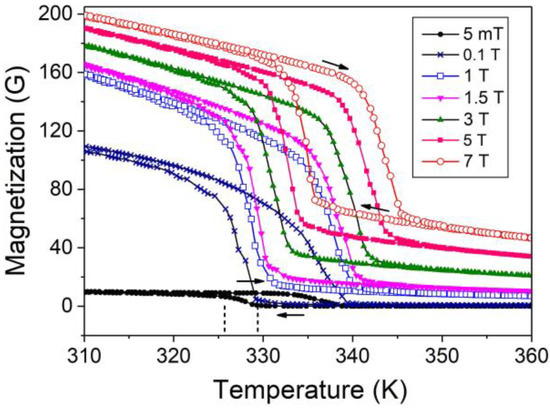 A polycrystalline alloy with nominal composition Ni50Mn17.5Ga25Cu7.5 was prepared from high-purity elements by arc melting under Ar atmosphere. The ingots were homogenized in vacuum quartz ampoules at 1170 K for 24 h and quenched in water at room temperature. The actual composition of the homogenized alloy was determined by energy-dispersive X-ray spectroscopy (EDS, Bruker X-flash detector 4010, EDS, Bruker X-flash detector 4010, Bruker, Germany) in a scanning electron microscope (Hitachi S-3400 N, Hitachi S-3400 N, Hitachi, Japan), and shown to be Ni49.3Mn17.8Ga25.2Cu7.7. The temperature dependences of magnetization of this alloy measured for different values of external magnetic field are shown in Figure 1.