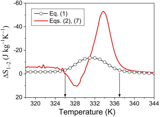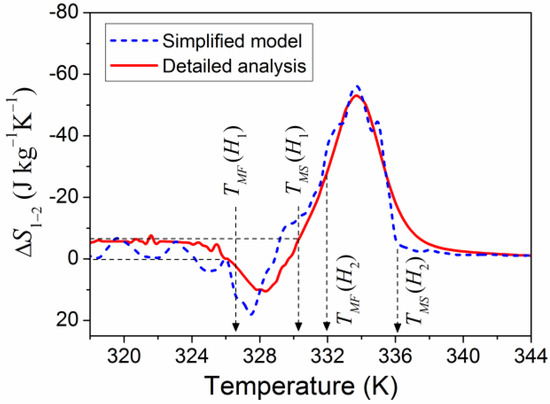 where the temperatures and correspond to the half-maximum values of function [20]. However, for the comparison of two ways of estimating MCE, it is more instructive to have these temperatures equal to the and , because these temperatures bound the temperature interval of large absolute values of entropy changes computed in two different ways, that is, from the Maxwell relationship and from the free energy (as shown in Figure 6 by the vertical arrows). In this case, the refrigerant capacity calculated from the curve estimated from Maxwell relations is , while the simplified model and detailed analysis give . Thus, the relative difference in RC values is much smaller than the relative difference of maximum values of functions shown in Figure 6, because in our theory, the positive contribution to refrigerant capacity partially compensates for the negative one.