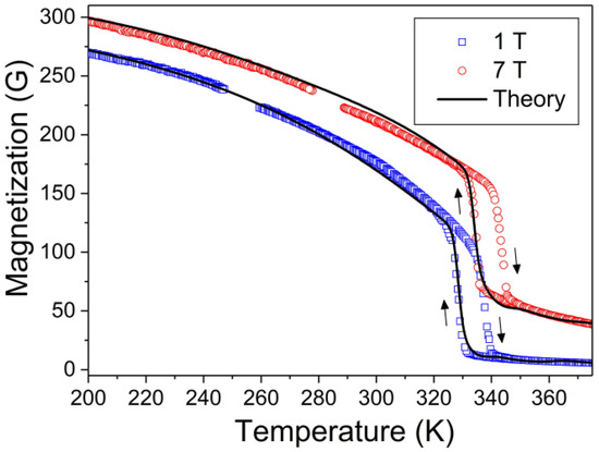 Figure 2 shows that the magnetic-field-induced entropy change can reach negative values of about −50 J kg−1K−1 due to the quick change of magnetization in the temperature range of MT in the magnetic field of 7 T, that is, between the temperatures and (see also Figure 1). The entropy change can be positive as well, due to the quick change of magnetization in the temperature range of MT in the magnetic field of 1 T, that is, between the temperatures and . The point is that the temperature ranges of MT in the fields H1 and H2 do not overlap (), so the positive term S(T,H2) in Equation (7) is not overcompensated by the negative term −S(T, H1) in the temperature interval . The inverse MCE arises due to the shift of phase transition temperature under the magnetic field. This effect will be analyzed below in the course of a detailed theoretical analysis of the field-induced entropy change.