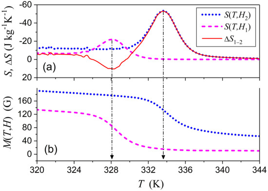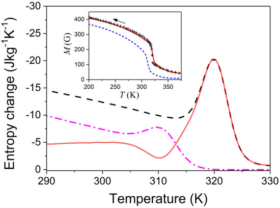 The magnetic-field-induced entropy change resulting from Equations (8)–(14) is shown in Figure 4a and represented by solid line in Figure 2 to illustrate the quantitative agreement between the predictions of the simplified model and detailed analysis of MCE. In this relation, it should be emphasized that both the simplified model and detailed analysis are based only on three principal points, namely, (i) the experimentally-observed shift of MT temperature under a magnetic field, (ii) the relationship between the entropy and free energy (Equation (2)), and (iii) the expression for the magnetic free energy of a ferromagnetic solid (Equations (3) and (8)). It should be emphasized that the Equation (2) is one of fundamental relationships of thermodynamics; the Equations (3) and (8) are derived from the quantum mechanical Heisenberg expression for the Hamiltonian describing the spin-exchange interaction and from the fundamental electrodynamic equation for the energy of magnetic moment in an external magnetic field. Therefore, the predicted possibility of the observation of conventional and inverse MCE in two neighboring temperature intervals is well-grounded, and may be considered as a guide for experiments. One of the obstacles to the observation of inverse MCE may be related to the narrow (~2–5 K) temperature interval of negative entropy change (see Figure 2). However, this difficulty is surmountable: conventional and inverse MCE were observed in Ni50Mn35In15 in the narrow temperature interval ~10K [17,18,19].