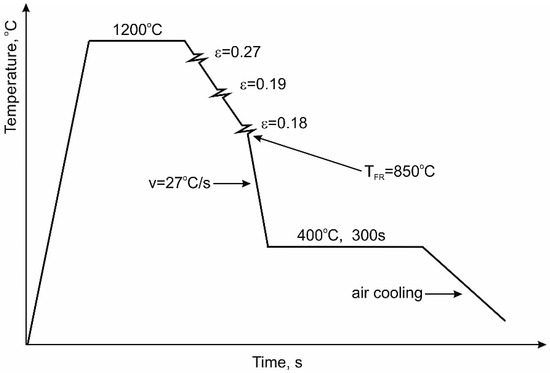 The investigated steel was prepared by vacuum induction melting. Then, the laboratory ingots were hot-forged to obtain flat samples with a thickness of 22 mm. The next steps included roughing rolling and the thermomechanical rolling process.