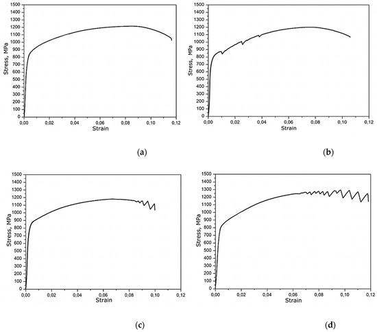 Engineering stress-strain curves of investigated steel registered at: (a) 20 °C, (b) 60 °C, (c) 100 °C, and (d) 140 °C.