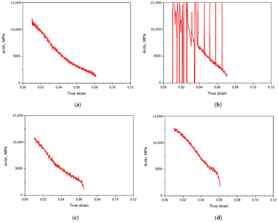 Work hardening rate as a function of true strain (uniform deformation range) at: (a) 20 °C, (b) 60 °C, (c) 100 °C, and (d) 140 °C.