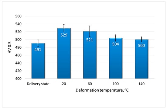 Mechanical properties of the steels were also assessed by hardness tests using the Vickers method. The obtained results are presented in Figure 4. It is clear that hardness values are affected by the deformation temperature. They are at a relatively high level taking into account the carbon content in the steel (490–530 HV). The lowest hardness was detected for the specimen in a hot-rolled state. All the hardness results were higher for plastically deformed samples. It was found that the highest hardness was obtained for the sample tensile tested at room temperature. Then, the hardness decreases when increasing the deformation temperature. The presented results are in reasonable agreement with the mechanical properties obtained from the static tensile tests (Table 2). Some variations could be due to the different intensity of the TRIP effect and PLC effect at different temperatures.